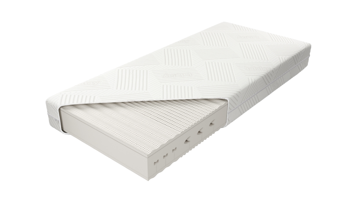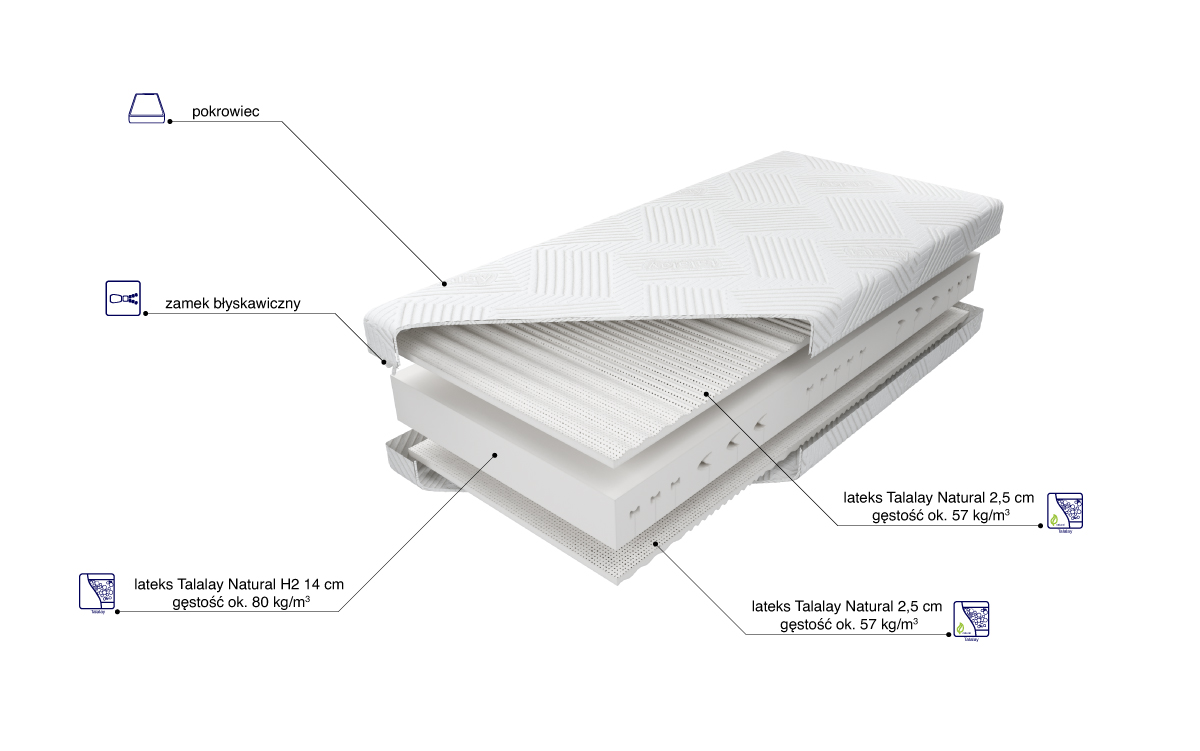 “Wkład materaca o wysokości ok. 19 cm złożony jest ze 100% naturalnego lateksu. Rdzeń materaca stanowi 14 cm wkład lateksu naturalnego Talalay o twardości H2, wycinany konturowo, obłożony obustronnie płatami lateksu naturalnego ciętego w fale. Posiada siedem stref twardości utrzymujących poszczególne części ciała. Zastosowana struktura przyczynia się do doskonałej wentylacji, zapewnia komfort i optymalne podparcie. Materac posiada dodatkowy pokrowiec wewnętrzny, zapewniający większą ochronę wkładu. Zastosowanie zamka błyskawicznego, który umożliwia zdjęcie i wypranie pokrowca zewnętrznego, znacząco ułatwia utrzymanie go w czystości”