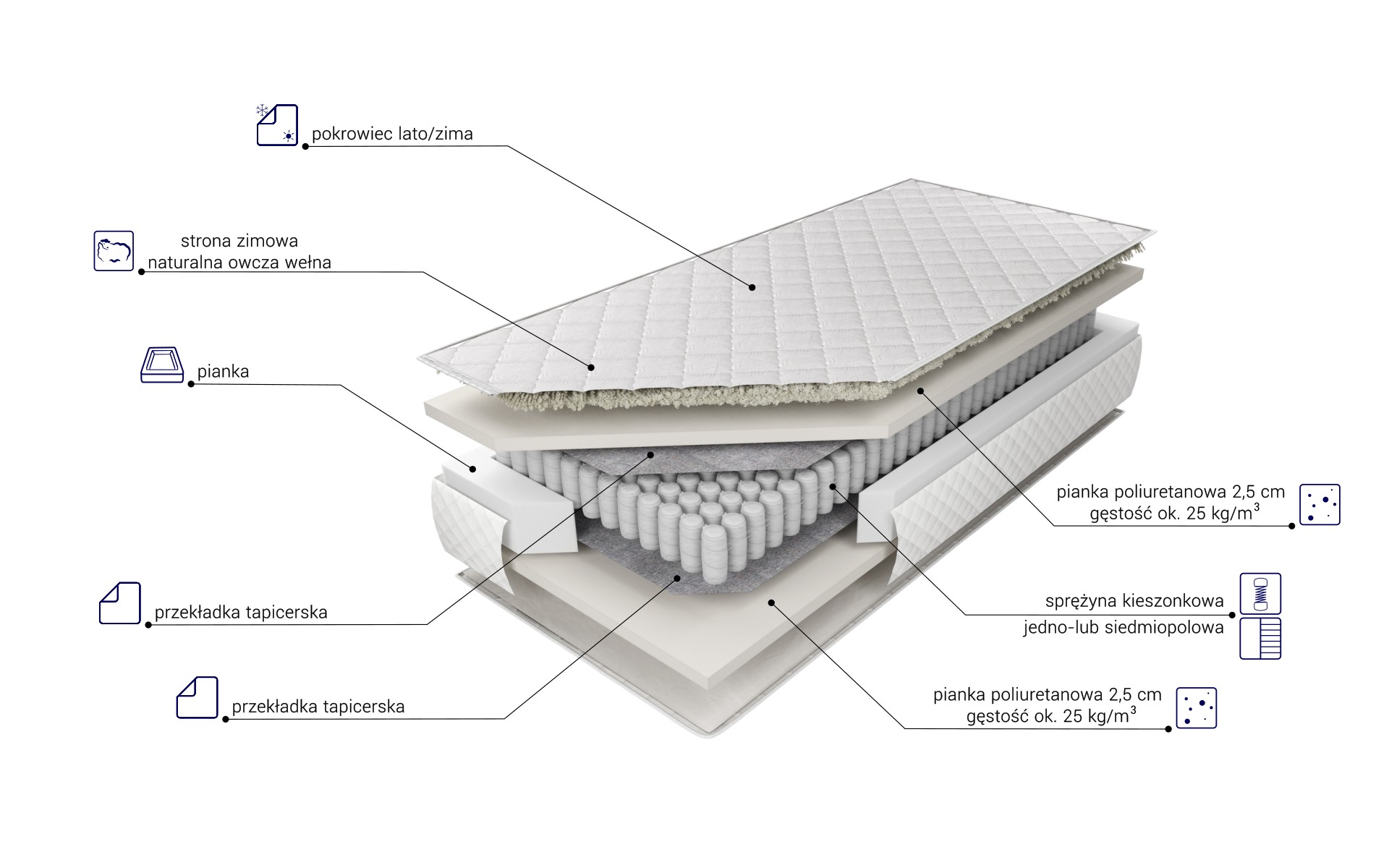 “Materac o wysokości ok. 19 cm (w zależności od pokrowca) zbudowany ze sprężyn Pocket z wysokogatunkowego drutu, umieszczonych w pojedynczych kieszonkach o średnicy 58 mm. Takie rozwiązanie poprawia elastyczność i zwiększa punktowe podparcie ciała. Obustronnie w materacu użyta została 2,5 cm warstwa wytrzymałej, nie odkształcającej się pianki poliuretanowej. Zastosowana z każdej strony przekładka tapicerska doskonale izoluje, zwiększa twardość i wydłuża żywotność produktu. Wykorzystanie zamka błyskawicznego, który umożliwia zdjęcie i wypranie pokrowca, znacząco ułatwia utrzymanie go w czystości. Pozbawiony możliwości zdjęcia jest pokrowiec typu lato-zima, posiadający od strony letniej owatę antyalergiczną, a od strony zimowej naturalną owczą wełnę.”