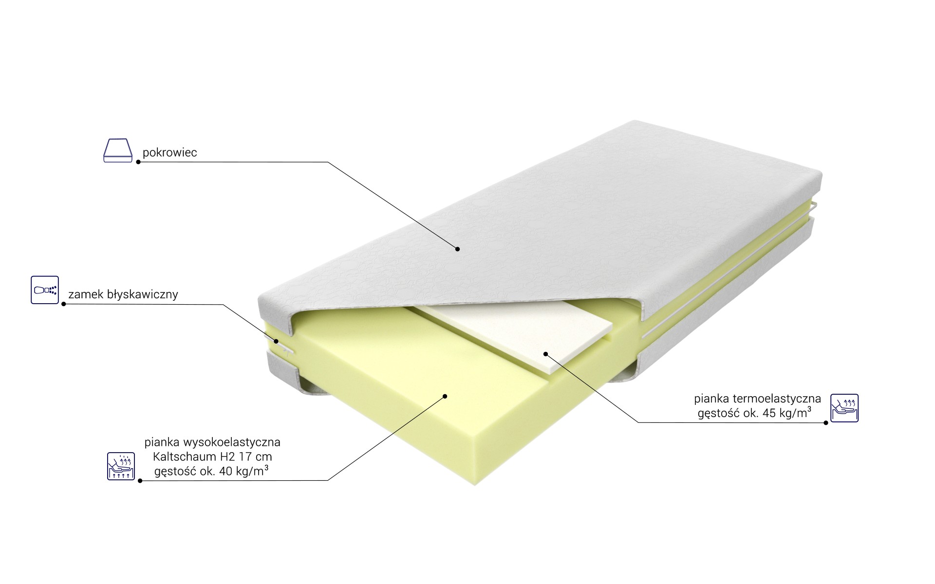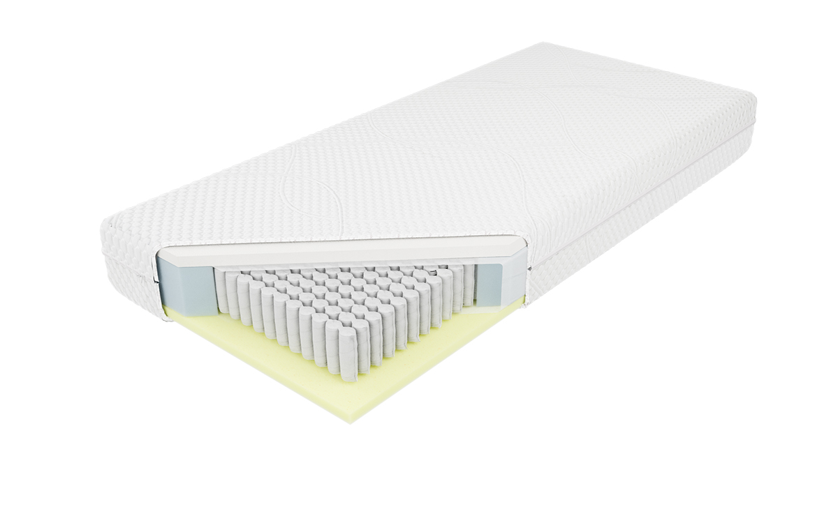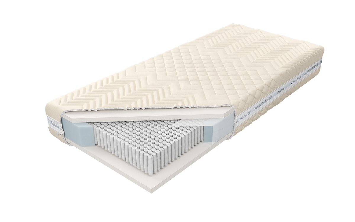 “Materac o wysokości ok. 19 cm (w zależności od pokrowca) zbudowany jest z 17 cm warstwy wysokoelastycznej pianki Kaltschaum z jednostronnie konturowo wyciętymi kanałami powietrznymi zwiększającymi wentylację wewnętrzną, cechującej się zwiększoną sprężystością, dającej możliwość optymalnej ergonomii i podparcia ciała. Dodatkowo, na wysokości ramion i kolan zastosowana została pianka termoelastyczna, która pod wpływem temperatury idealnie dopasowuje się do kształtu ciała, by zapewnić wyjątkowy komfort snu. Istnieje możliwość wyboru poziomu twardości materaca. Materac posiada siedem stref twardości utrzymujących poszczególne części ciała w położeniu dopasowanym do budowy anatomicznej. Zapewnienie wysokiego poziomu czystości możliwe jest dzięki zastosowaniu zamka błyskawicznego umożliwiającego zdjęcie pokrowca.”
