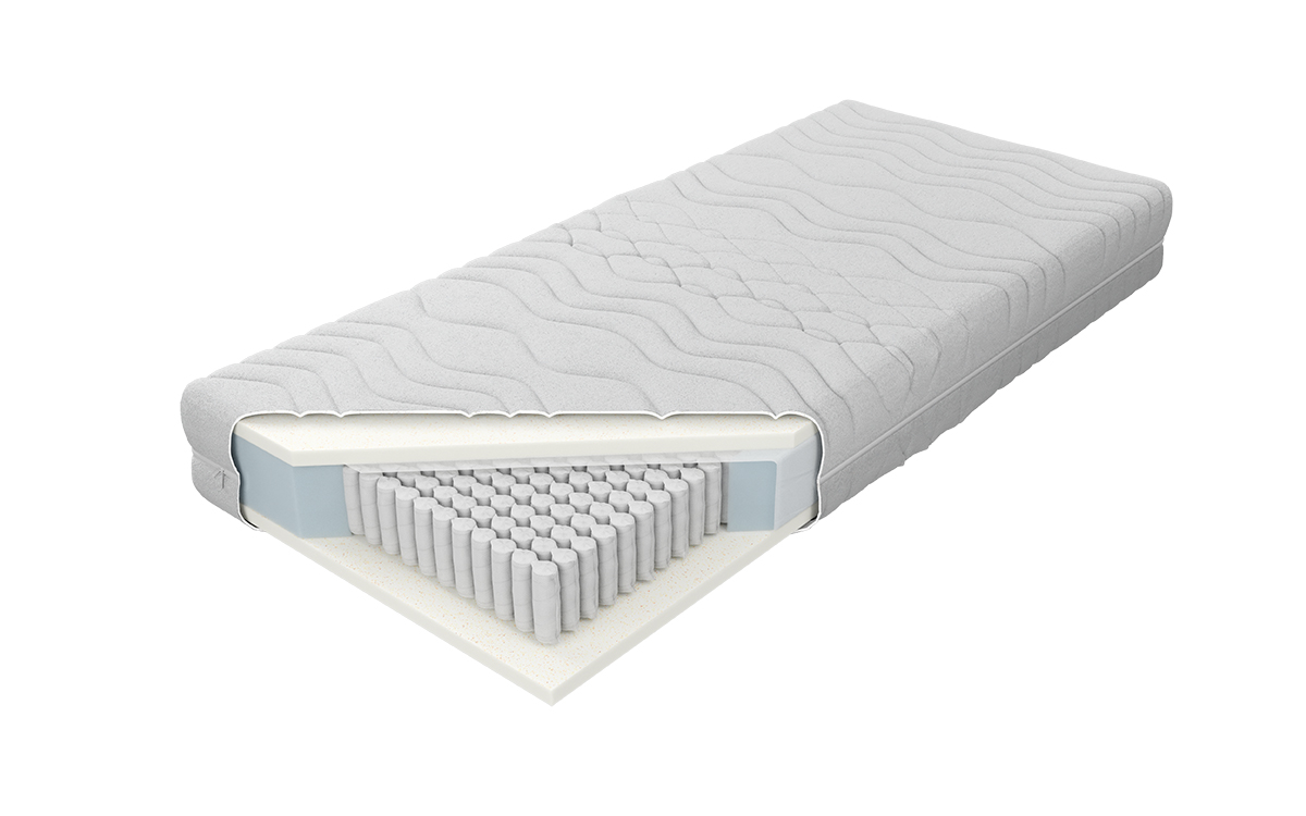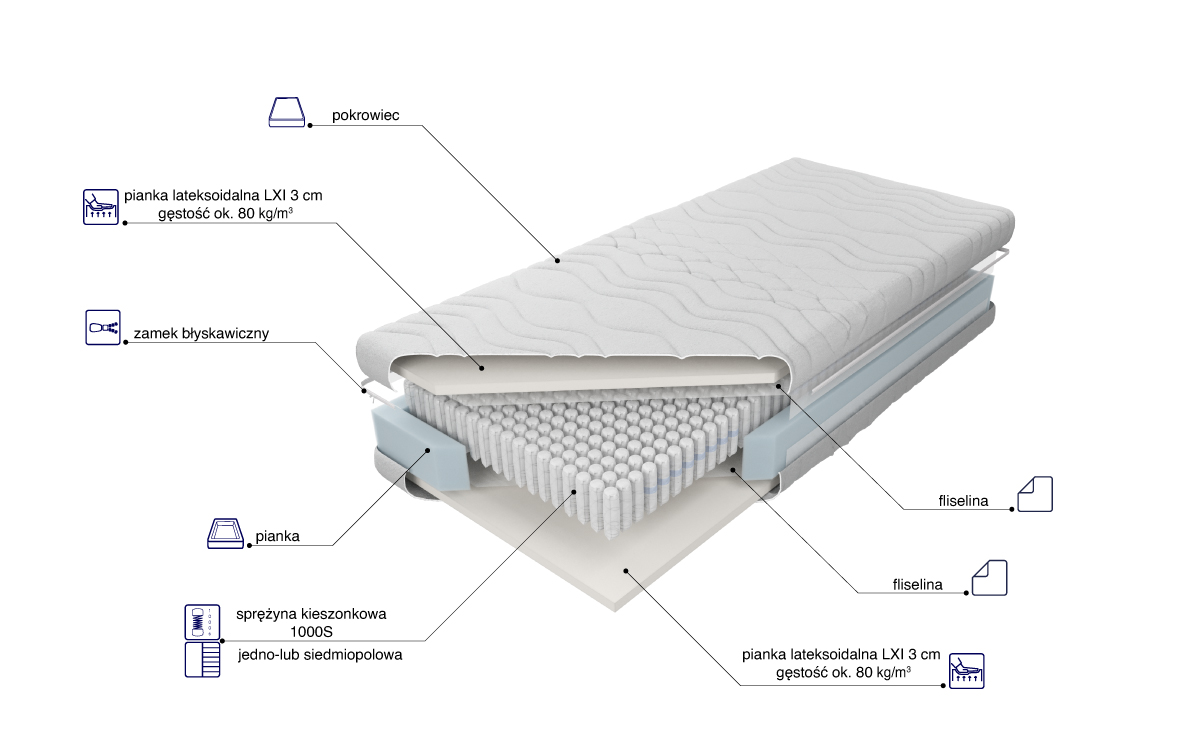 “Materac o wysokości wkładu ok. 19 cm zbudowany ze sprężyn 1000 S z wysokogatunkowego drutu, umieszczonych w pojedynczych kieszonkach o średnicy 3,9 cm. Takie rozwiązanie poprawia elastyczność i zwiększa punktowe podparcie ciała. Istnieje możliwość wyboru sprężyn jedno lub siedmiopolowych. Materac siedmiopolowy posiada siedem stref twardości utrzymujących poszczególne części ciała. Po obu stronach materaca została użyta 3 cm pianka lateksoidalna posiadająca dużą elastyczność punktową, dzięki której idealnie dopasowuje się do budowy anatomicznej użytkownika, stanowiąc optymalną podporę dla kręgosłupa. Nie gromadzi roztoczy, jest polecana dla alergików. Istnieje możliwość wyboru twardości materaca, klient decyduje o twardości sprężyn H2 lub H3. Wykorzystanie zamka błyskawicznego, który umożliwia zdjęcie i wypranie pokrowca, znacząco ułatwia utrzymanie go w czystości.”