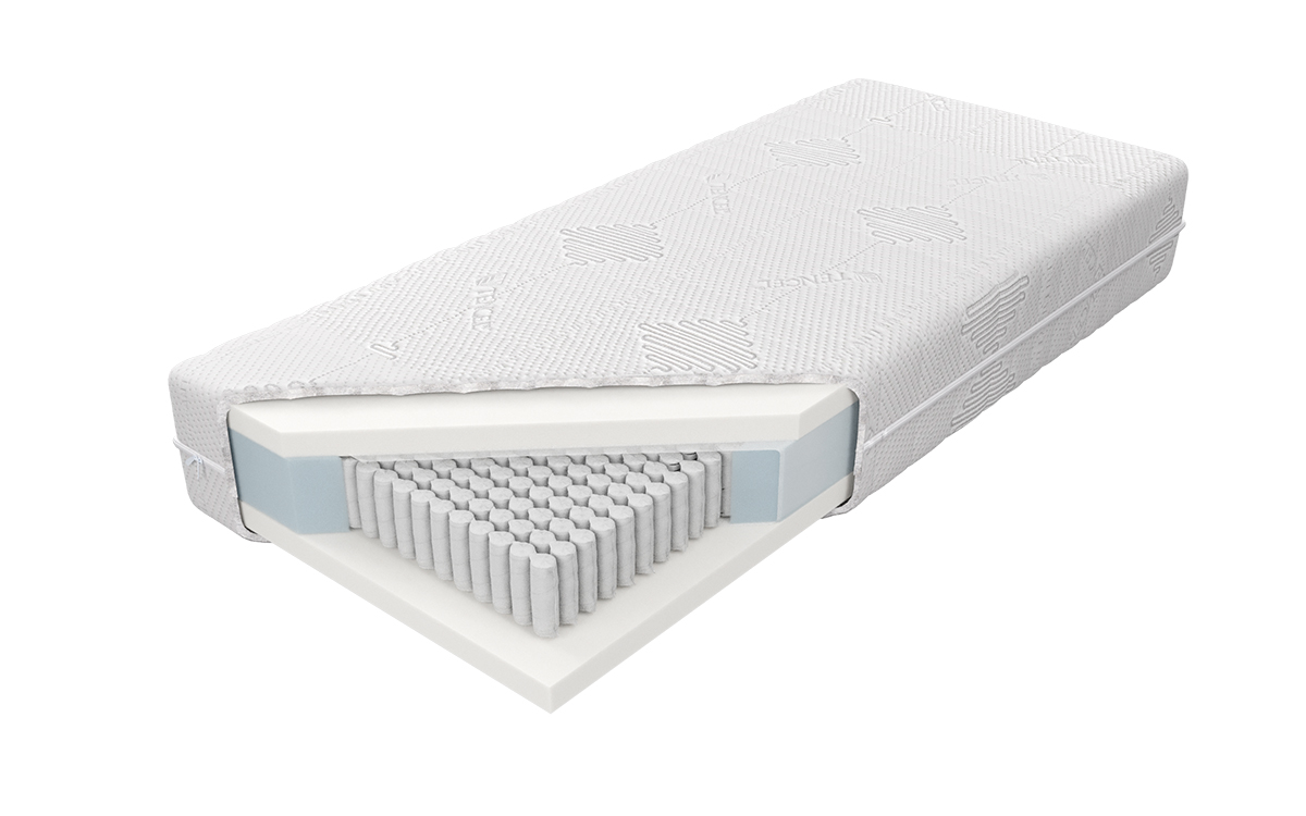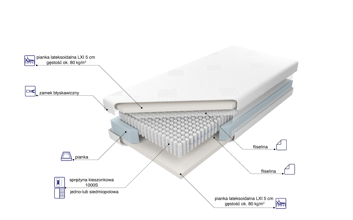 “Materac o wysokości wkładu ok. 23 cm zbudowany ze sprężyn 1000 S z wysokogatunkowego drutu, umieszczonych w pojedynczych kieszonkach o średnicy 3,9 cm. Takie rozwiązanie poprawia elastyczność i zwiększa punktowe podparcie ciała. Istnieje możliwość wyboru sprężyn jedno lub siedmiopolowych. Materac siedmiopolowy posiada siedem stref twardości utrzymujących poszczególne części ciała. Po obu stronach materaca została użyta 5 cm pianka lateksoidalna, posiadającej dużą elastyczność punktową, dzięki której idealnie dopasowuje się do budowy anatomicznej użytkownika, stanowiąc optymalną podporę dla kręgosłupa. Nie gromadzi roztoczy, jest polecana dla alergików. Istnieje możliwość wyboru twardości materaca, klient decyduje o twardości sprężyn H2 lub H3. Wykorzystanie zamka błyskawicznego, który umożliwia zdjęcie i wypranie pokrowca, znacząco ułatwia utrzymanie go w czystości.”