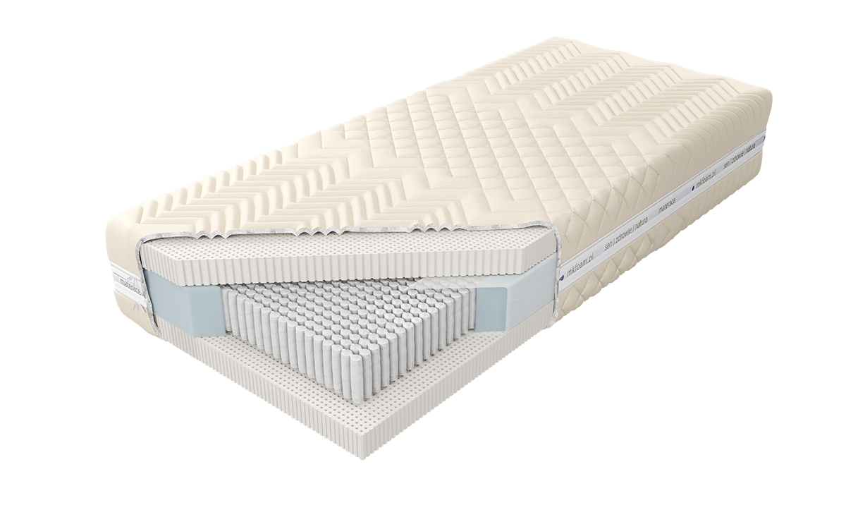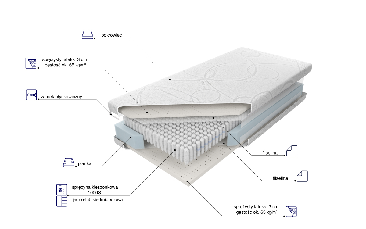 “Materac o wysokości wkładu ok. 19 cm zbudowany jest ze sprężyn 1000 S z wysokogatunkowego drutu, umieszczonych w pojedynczych kieszonkach o średnicy 3,9 cm. Istnieje możliwość wyboru sprężyn jedno lub siedmiopolowych. Materac siedmiopolowy posiada siedem stref twardości utrzymujących poszczególne części ciał w położeniu dopasowanym do budowy anatomicznej. Po obu stronach materaca została użyta 3 cm warstwa lateksu o dużej gęstości, zapewniającego optymalne podparcie i komfort podczas snu. Posiada właściwości antygrzybiczne, antyroztoczowe i antybakteryjne, cechuje się długą żywotnością. Istnieje możliwość wyboru twardości materaca, klient decyduje o twardości sprężyn H2 lub H3. W utrzymaniu higieny służy zamek błyskawiczny, umożliwiający zdjęcie i wypranie pokrowca.”