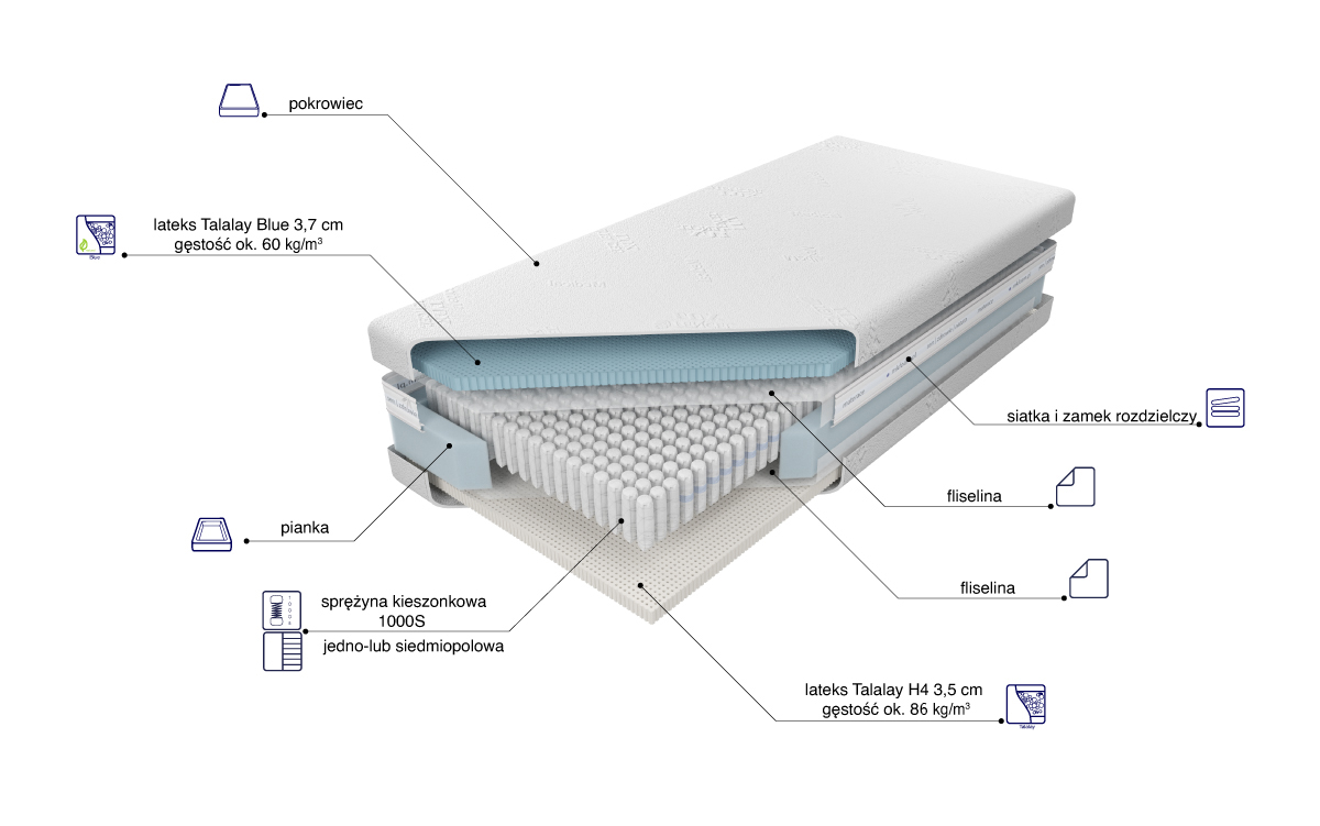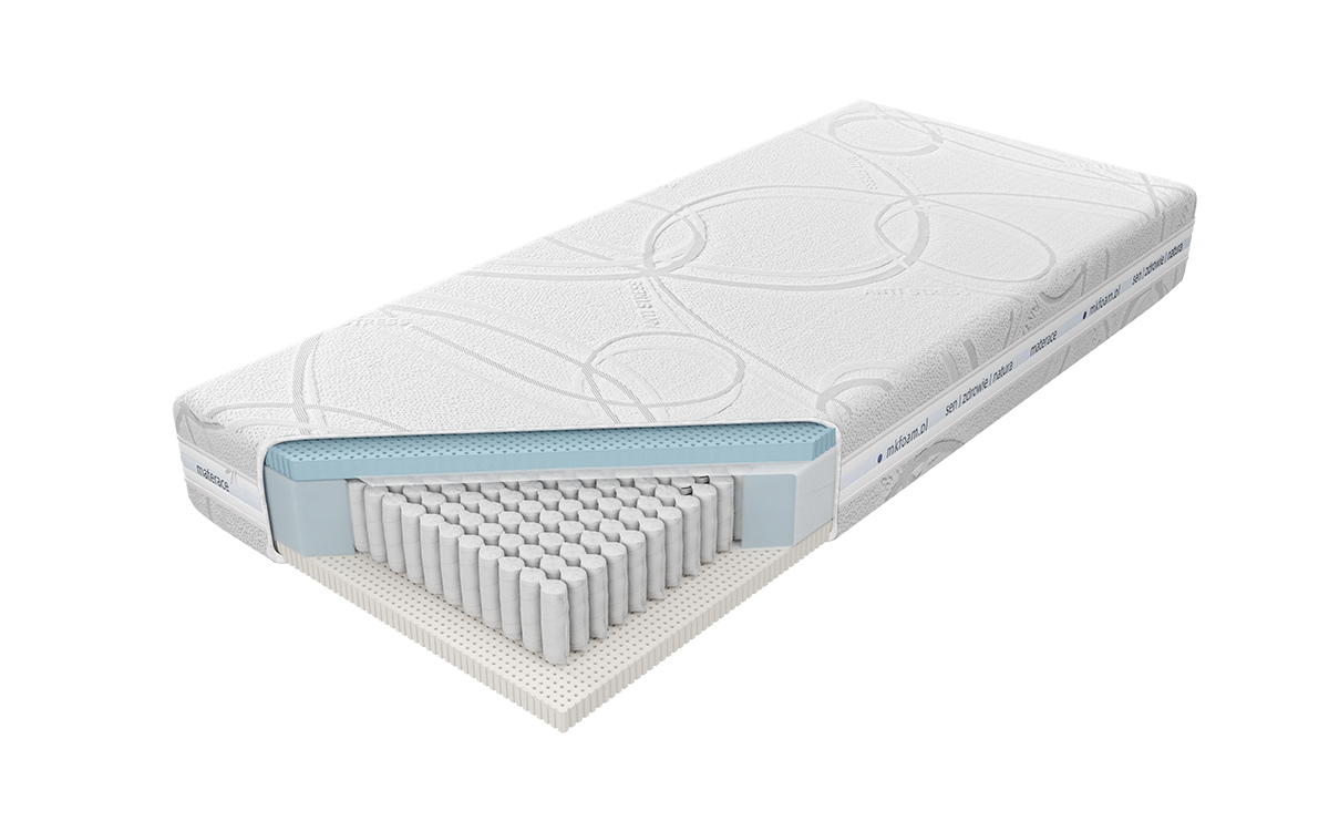 “Materac o wysokości wkładu ok. 20 cm zbudowany ze sprężyn 1000S z wysokogatunkowego drutu, umieszczonych w pojedynczych kieszonkach o średnicy 3,9 cm. Takie rozwiązanie poprawia elastyczność i zwiększa punktowe podparcie ciała. Istnieje możliwość wyboru sprężyn jedno lub siedmiopolowych. Materac siedmiopolowy posiada siedem stref twardości utrzymujących poszczególne części ciała. Z jednej strony materaca znajduje się 3,7 cm warstwa lateksu Talalay Blue, posiadającego umiejętność utrzymania równowagi cieplnej. Odpowiednio oddaje lub pobiera energię w zależności od wahań temperatury, eliminując problem z potliwością. Otwartokomórkowa struktura zwiększa poziom cyrkulacji powietrza, zapewnia optymalne podparcie i komfort. Z drugiej strony użyta została 3,5 cm warstwa naturalnego lateksu Talalay, produkowanego na bazie naturalnego mleczka kauczukowego, o strukturze sprzyjającej wymianie powietrza oraz prawidłowemu ułożeniu kręgosłupa. Wykorzystanie zamka błyskawicznego, który umożliwia zdjęcie i wypranie pokrowca, znacząco ułatwia utrzymanie go w czystości.”